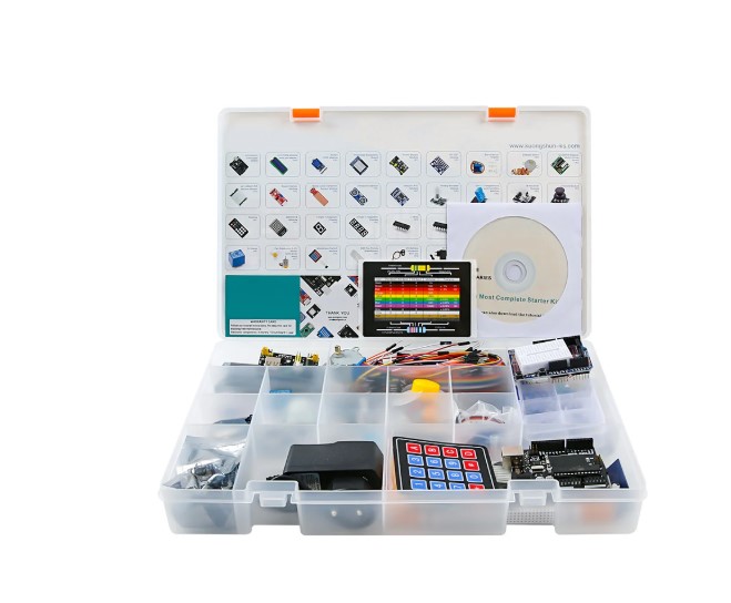 - LAFVIN Starter Kit for Arduino UNO R3 Ultimate Starter Set Full Version Learning DIY Kit Project for UNO with Tutorials ★Perfect choice for beginners to learn,easy to make usual circuits. ★100% compatible with program.with USB cable. ★All components compatible with IDE, can be used directly. ★LAFVIN Ultimate Starter kit include over 72 items and 200 components. ★With detail tutorial user manual containing more than 30 lessons,code,Libraries, datasheets, and so on. Notice:The Charger we default to send the EU plug, if you want to change to US or UK plug, please leave a message to us on the order. Component listing: 5pcs White LED 5pcs Yellow LED 5pcs Blue LED 5pcs Green LED 5pcs Red LED 1pcs RGB LED 5pcs 22pf Ceramic Capacitor 5pcs 104pf Ceramic Capacitor 2pcs Photoresistor 1pcs Thermistor 5pcs Diode Rectifier (1N4007) 2pcs Electrolytic Capacitor (10UF 50V) 2pcs Electrolytic Capacitor (100UF 50V) 5pcs NPN Transistor (PN2222) 5pcs NPN Transistor (S8050) 1pcs Tilt Switch 5pcs Button (small) 1pcs 1 digit 7-segment Display 1pcs 4 digit 7-segment Display 1pcs Sound Sensor Module 1pcs LCD1602 Module (with pin header) 1pcs IC L293D 1pcs IC 74HC595 1pcs Active Buzzer 1pcs Passive Buzzer 1pcs RTC Module 1pcs DHT11 Temperature and Humidity Module 2pcs Potentiometer (10k) 1pcs Rotary Encoder Module 1pcs Joystick Module 1pcs Keypad Module 1pcs 5V Relay 1pcs IR Receiver Module 1pcs R3 Controller Board 1pcs 830 Tie-Points Breadboard 1pcs Servo Motor (SG90) 1pcs Stepper Motor 1pcs ULN2003 Stepper Motor Driver Board 1pcs Prototype Expansion 1pcs Power Supply Module 1pcs HC-SR501 PIR Motion Sensor 1pcs Ultrasonic Sensor 1pcs GY-521 Module 1pcs 3V Servo Motor (Soldered Wire) 1pcs Fan Blade 1pcs MAX7219 Module 1pcs Remote 1pcs 9V 1A Power Supply 1pcs 65 Jumper Wire 1pcs Water Lever Sensor 1pcs USB Cable 1pcs 9V Battery Connector with DC 1pcs RC522 RFID Module 10pcs Resistor (10R) 10pcs Resistor (100R) 10pcs Resistor (220R) 10pcs Resistor (330R) 10pcs Resistor (1K) 10pcs Resistor (2K) 10pcs Resistor (5K1) 10pcs Resistor (10K) 10pcs Resistor (100K) 10pcs Resistor (1M) 20pcs Female-to-male Dupont Wire 1pcsResistance Identification Card 1pcs CD with Tutorial