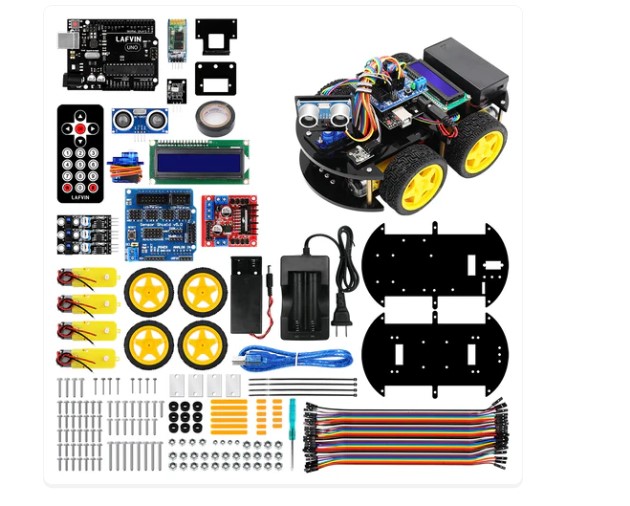 - 1pcs UNO R3 1pcs USB cable 1pcs V5.0 Expansion board 1pcs LCD1602 I2C 1pcs L298N motor driver board 1pcs Ultrasonic Sensor 1pcs Ultrasonic holder 1pcs Servo motor 1pcs Servo motor fixed plate 1pcs Bluetooth module 3pcs Line tracking module 4pcs Motor 4pcs High friction wheel 1pcs Remote 1pcs IR Receiver Module 1pcs Cell box 1pcs 18650 battery charger 1pcs Black tape 2pcs Acrylic plates 17pcs Copper cylinder 8pcs M3*30mm 3pcs M3*12mm 15pcs M3*10mm 34pcs M3*8mm 4pcs M2*12mm 4pcs M1.6*12mm 4pcs Aluminium Block 34pcs Nut 9pcs Plastic shim 1pcs 40pin F-F dupont wire 1pcs Screwdriver 4pcs Bunding belt 1pcs Plastic box 1pcs Tutorial CD