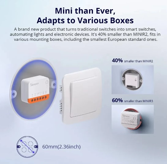 Sonoff”s tiny little Sonoff Mini Extreme (MINIR4) module is one of the smallest WiFi relays on the market, it has only 33 x 40mm size, so it will fit into even the smallest wall box.